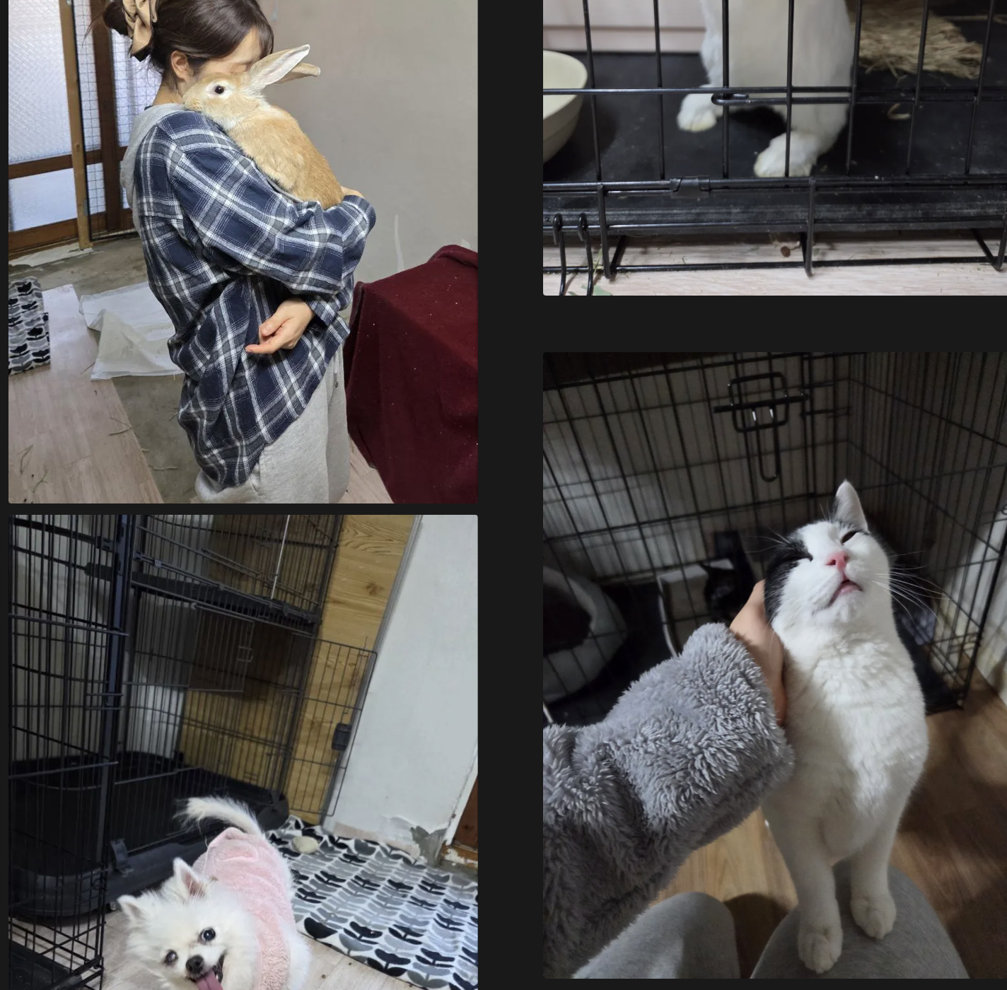 안락사 명단에 오르고 죽을 고비를 넘긴 강아지, 고양이, 토끼가 머무르고 있어요(가끔 기니피그도요). 아파서 약을 먹는 아이, 골절 치료 중인 아이, 농장에서 교배에 이용되다 버려진 아이까지 사연은 제각각이지만 모두의 바람은 같아요. "이제는 평생 함께할 엄마 아빠를 만나고 싶어." 자주 가지 못해도 갈 때마다 아이들이 문 앞까지 나와 온몸으로 반기며 데려가 달라는 듯 간절한 눈빛을 보내요. 간헐적으로 봉사해주시는 분들은 있지만, 정기적으로 함께해주실 분들은 아직 많이 부족합니다.